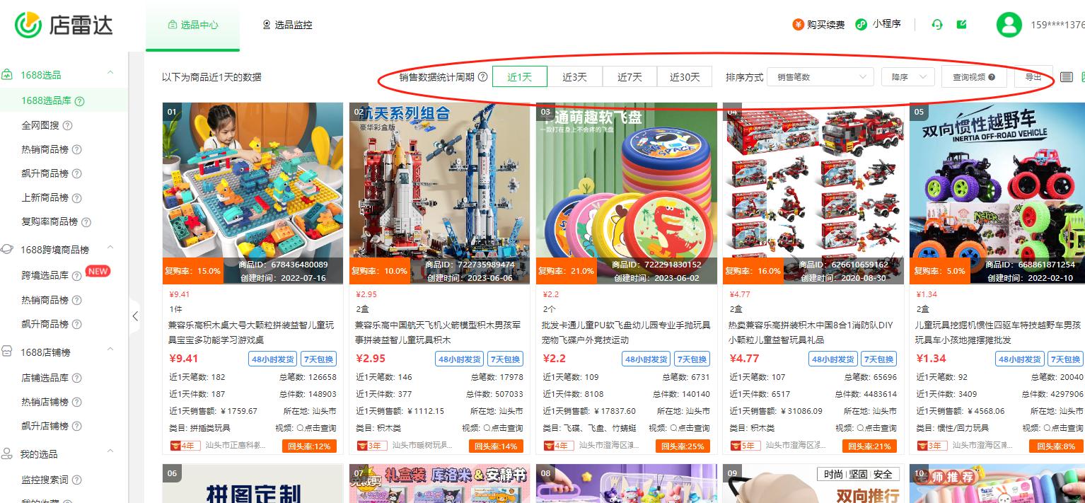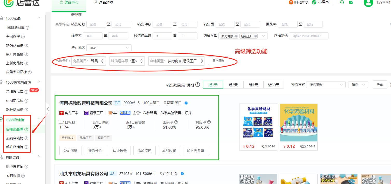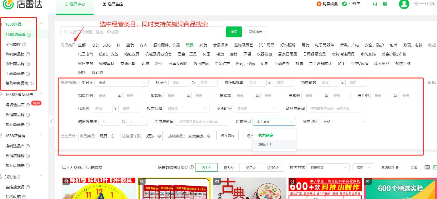 ●【店雷达】-【1688选品库】包括了1688平台全细分品类的产品库,通过标题关键词查找关联商品,并进行多维度分析销售笔数、销售额和历史趋势,快速定位所需产品。比如你是做玩具类目的商家,在选品库中选中了玩具类目后,可直接筛选诚信通年限,以及选择店铺类型,包括【实力商家】或者【超级工厂】,以及商品的上新时间、批发价格区间、最低起批量、销售笔数件数等条件。