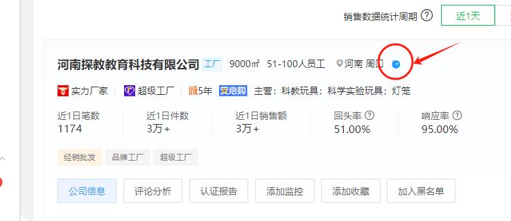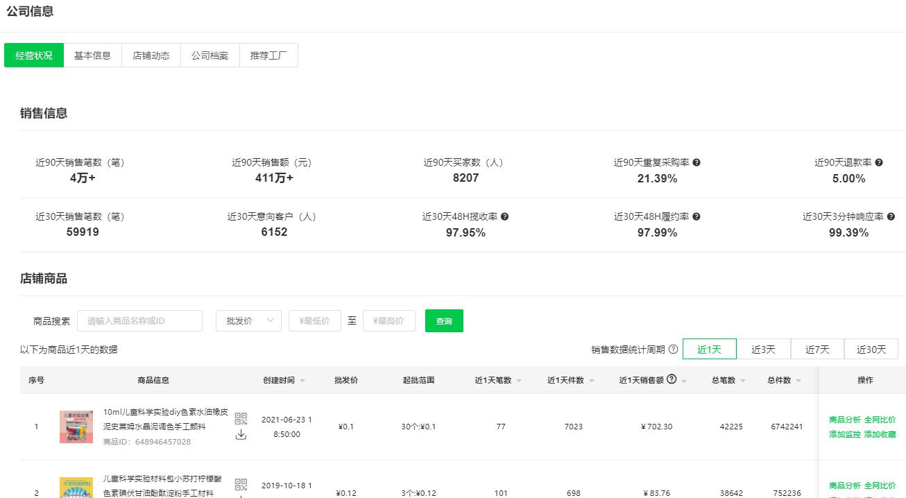 ●点击【公司信息】即可查看店铺的综合信息(包括经营状况、服务评分、店铺动态等)以及店铺商品历史销量,进一步判断供应商的综合实力。优先选择评价高、销量大的店铺,意味着他们的产品更受市场欢迎,服务质量更可靠。