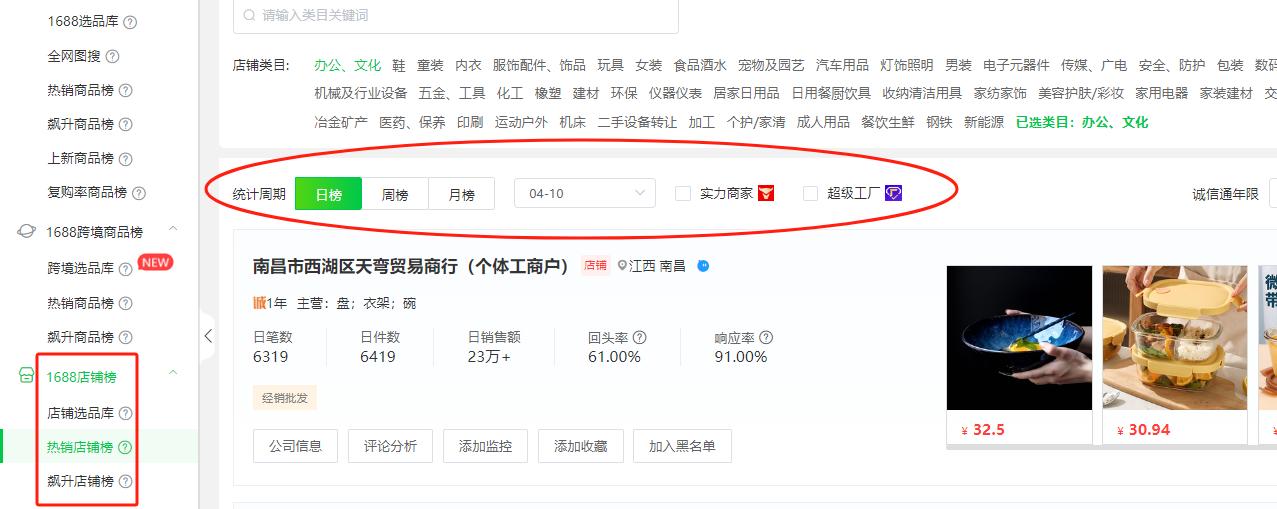 ●想要更加全面的了解供应商,可以通过店雷达的1688店铺榜,帮助商家发现1688近期销量好的店铺,以及近期增长趋势高的店铺,综合店铺的飙升幅度和公司信息,挖掘近段时间保持良好的运营和服务的店铺。