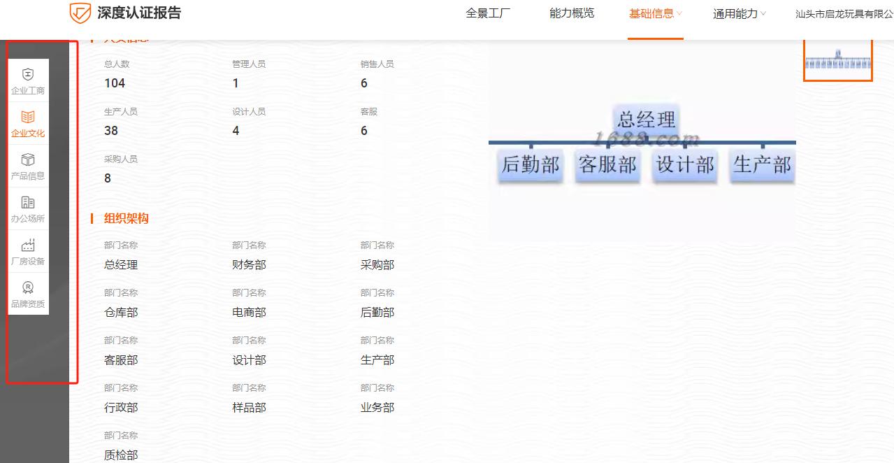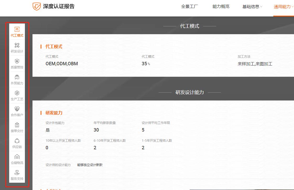 ●除了可以从公司的基本信息看,我们还可以直接从“认证报告”入口查看厂家的深度认证报告,除了可以能身临其境的看到工厂全景,厂家的营业执照、组织架构信息、样品展厅、办公场所、厂房与生产设备等基础信息、以及代工模式、研发设计、仓储物流等等。