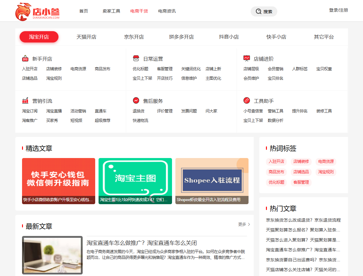 店小参平台 日常更新各大电商平台的平台规则、营销活动、运营教程,卖家可以通过选择不同平台、分类、热词标签查看想要的内容,或者在搜索框内输入关键词,即可查询想要了解的内容。
